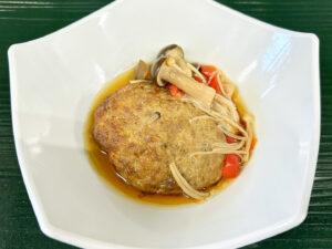 当院では、ハンバーグを作る際に「絹ごし豆腐」を入れることで、柔らかく食べやすくし、さらに脂質を抑えるようにしています。写真を撮ると大胆な方法で作っているように見えまずが、食事ごとに見えない工夫があります。