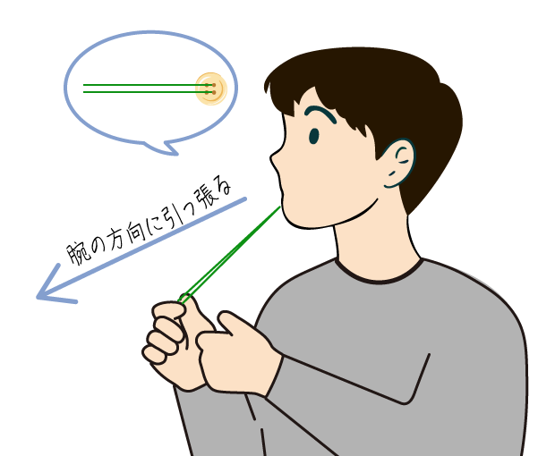 - 紐を通したボタンを唇と前歯の間に挟み、口をしっかり閉じる