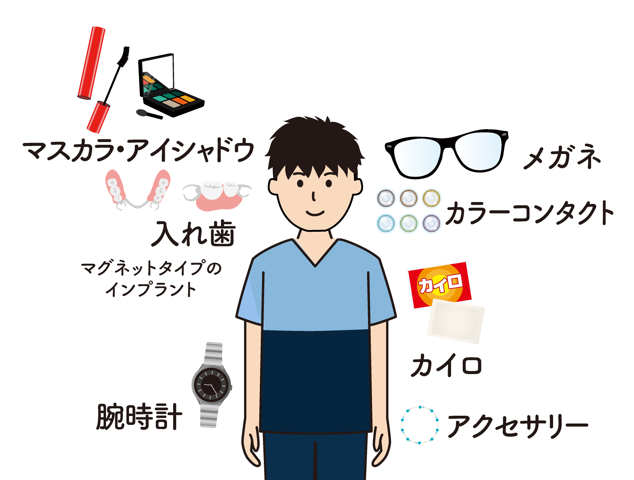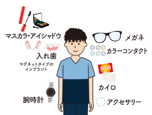 さらに、「メイク」「ネイル」「カラーコンタクトレンズ」「整髪料」「入れ歯」や「マグネットタイプのインプラント」などにも注意が必要です。特に、手指のネイルは落としていても、足のネイルを落とし忘れている場合や、アイメイク(特にアイシャドウ)をつけたままの場合や、入れ歯を外し忘れているケースがよく見受けられます。