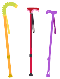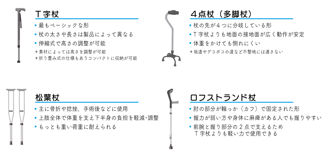 これは、その名の通り「歩行を補助するために使用する」もので、利用者に合ったものを選ぶことが重要です。特に「杖」は、室内・室外を問わず多くの方が使用している代表的な補助具のひとつです。今回は、当院で取り扱っている杖を中心にご紹介します。