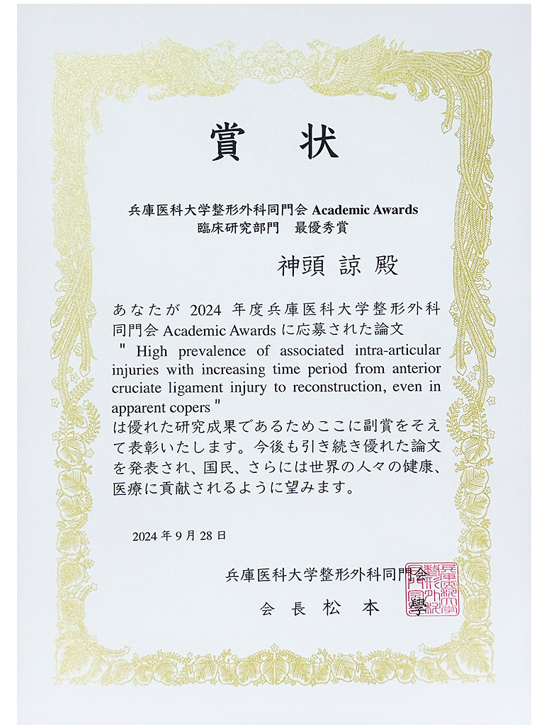 論文・発表・出版物実績 整形外科神頭医師が「兵庫医科大学整形外科同門会」にて最優秀賞に選出されました 2024/10/03 9月28日に開催された、兵庫医科大学整形外科の同門会にて、整形外科 神頭医師の論文が、「Academic Awards臨床研究部門」の最優秀賞に選出されました。 今後も当院での治療結果を学会や論文で発表し、医療発展への一助になれるようつとめてまいります。