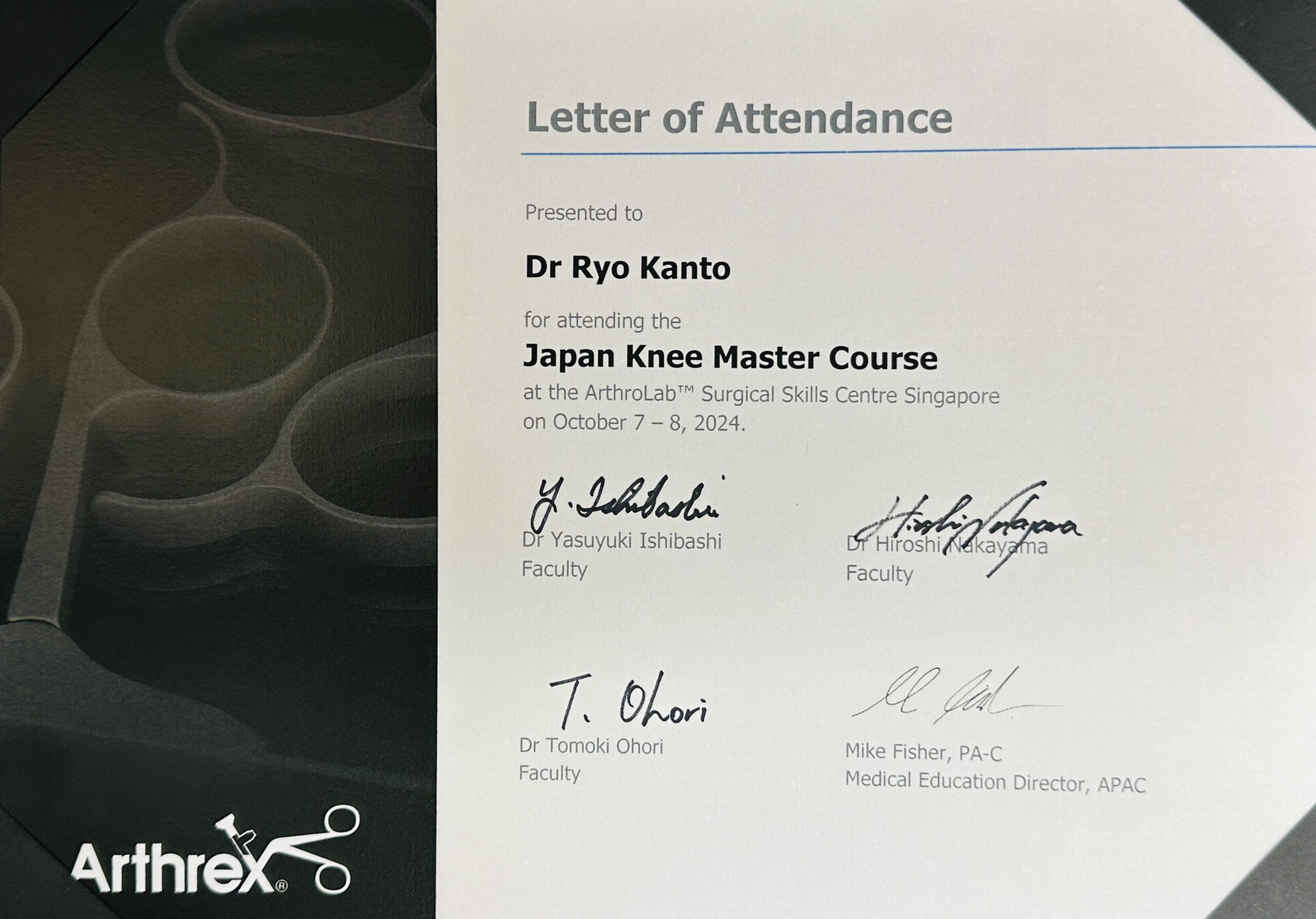 整形外科 Cadaver trainingに参加しました 2024/10/18 整形外科の神頭医師10月7日・8日の2日間にわたり、Arthrex JapanのKnee Master Course 2024のcadaver trainingに参加しました。 膝・スポーツ・関節鏡分野の手術手技のトレーニングおよび知識や技術の修得などを行いました。 引き続き膝関節治療に対して日々の診療に尽力いたします。