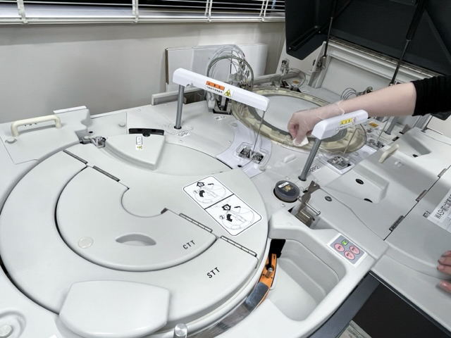こちらは、患者さんから採取した血液や尿などの検体を測定する機械のメンテナンスを行っている様子です。