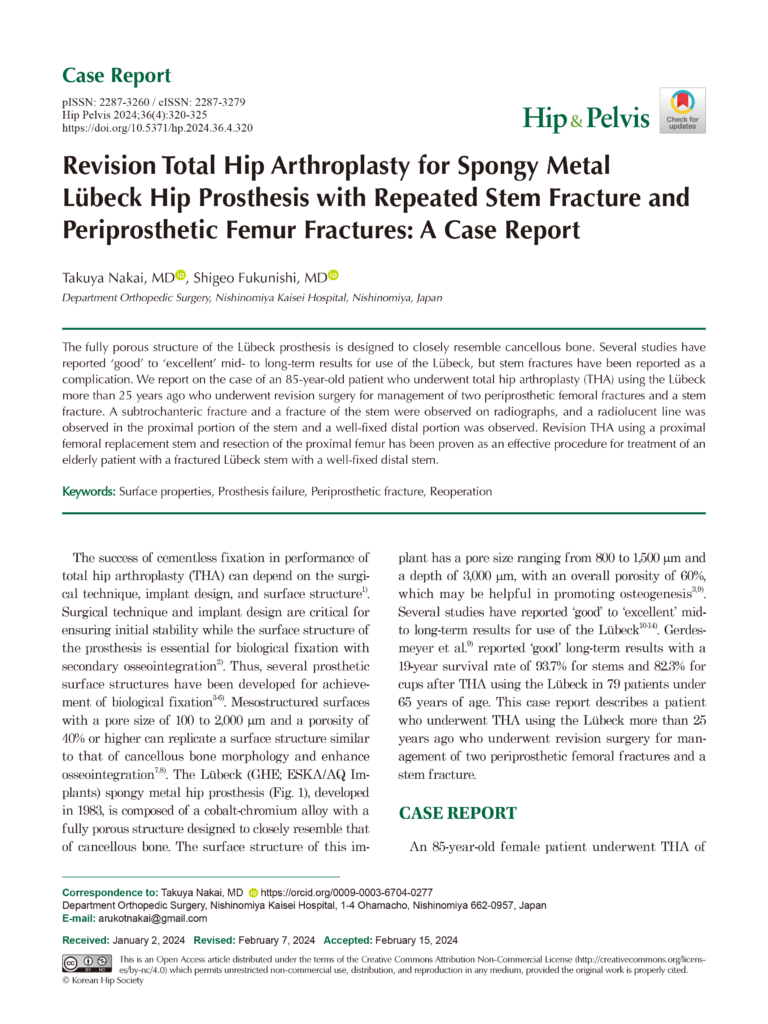 Lübeck Hip Prosthesis with Repeated Stem Fracture and Periprosthetic Femur Fractures: A Case Report」論文が、この度「Hip&Pelvis」の学会誌に掲載されました。