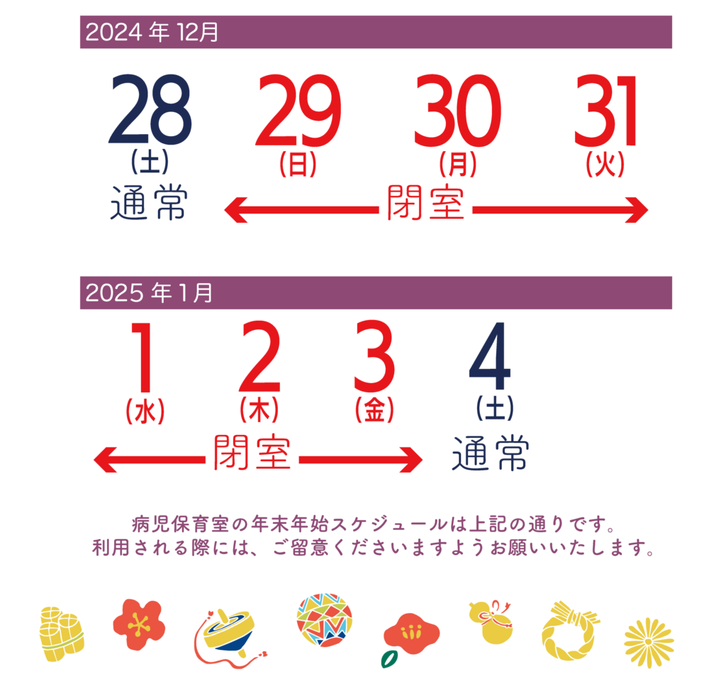 2024年の病児保育室 年末年始のご利用は、12月28日(土)までとなります。