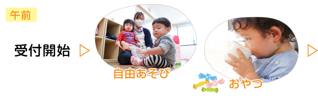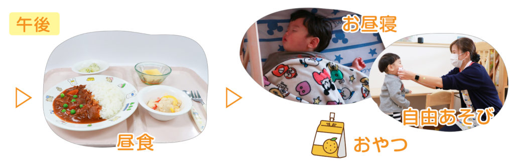 「おやつ」「昼食」「お昼寝」などの合間にお子さんの体調チェックしながら18時の閉室時間まで見守ります。