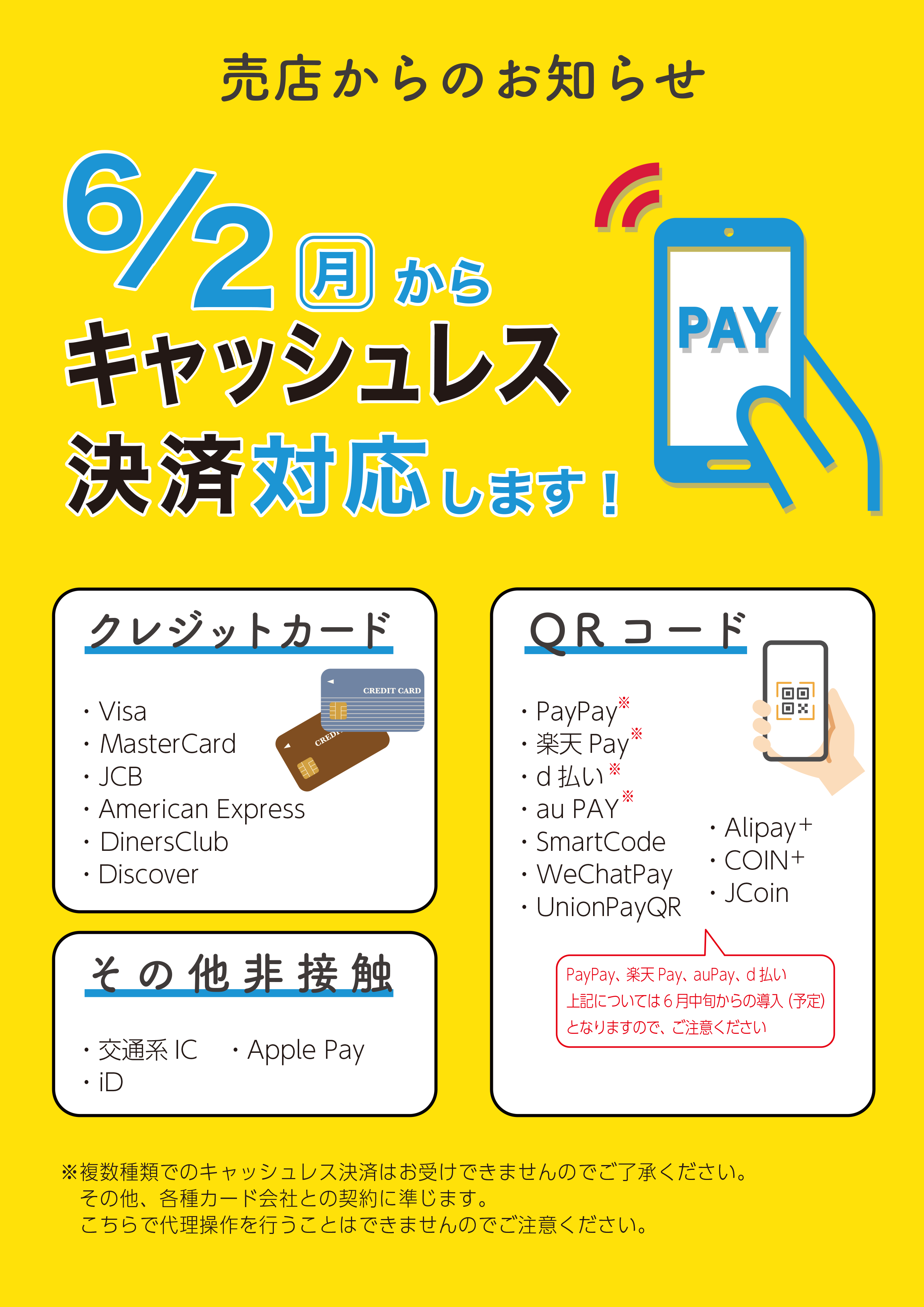 病院からのお知らせ 病院の売店でキャッシュレス決済を順次導入します 2025/05/28 患者さんからのご要望を受け、より便利にお買い物をしていただけるよう、2025年6月2日(月)より、北館5階の売店にてキャッシュレス決済の導入を順次開始することとなりました。 対応する決済方法により、実際のご利用開始時期が異なりますので、ご利用の際はあらかじめご確認いただけますようお願いいたします。 ご利用時の注意点 複数種類でのキャッシュレス決済はお受けできませんのでご了承ください 支払いに関することは各種カード会社との契約に準じます 売店職員が代理で操作を行うことはできません
