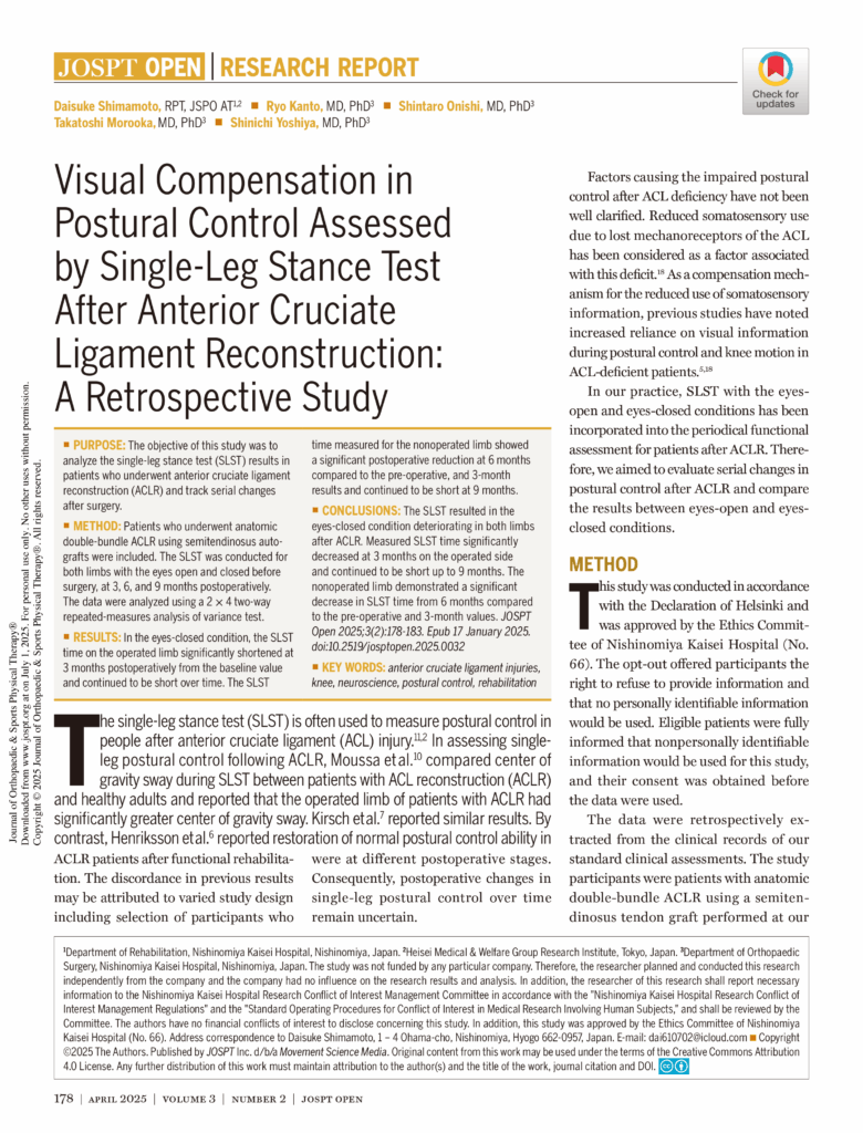 理学療法士の島本大輔が執筆した「Visual Compensation in Postural Control Assessed by Single-Leg Stance Test after Anterior Cruciate Ligament Reconstruction: A retrospective study」論文が「Journal of Orthopaedic & Sports Physical Therapy(3巻2号)」の学会誌に掲載されました。