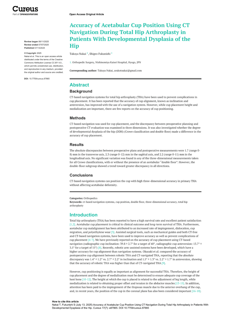 Navigation During Total Hip Arthroplasty in Patients With Developmental Dysplasia of the Hip」論文が、医科学分野の国際学術雑誌「Cureus」に掲載されました。