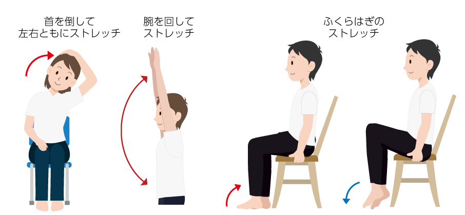PC作業やスマホを閲覧する時間が増えると、首や肩の血流が悪くなり、筋肉のこりにつながります。スキマ時間をみつけて、ゆっくりと首を回したり倒したり、肩を回すと効果的です。ほかにも、座りっぱなしが多い人には、ふくらはぎやアキレス腱を伸ばすストレッチも効果的です。特にふくらはぎは“第2の心臓”と呼ばれ、血流を押し戻す重要な役割があります。まずは20回程度を目指してストレッチをはじめませんか。