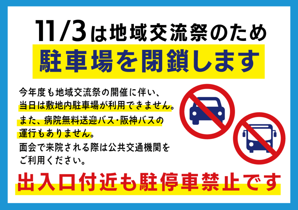 つきましては、当日(11月3日)にお見舞いにお越しの際は、当院の駐車場が利用できません。(敷地内に車を乗り入れることもできません)あわせて、11月3日は無料送迎バスは運行を中止し、阪神バスも当院には停車しません。