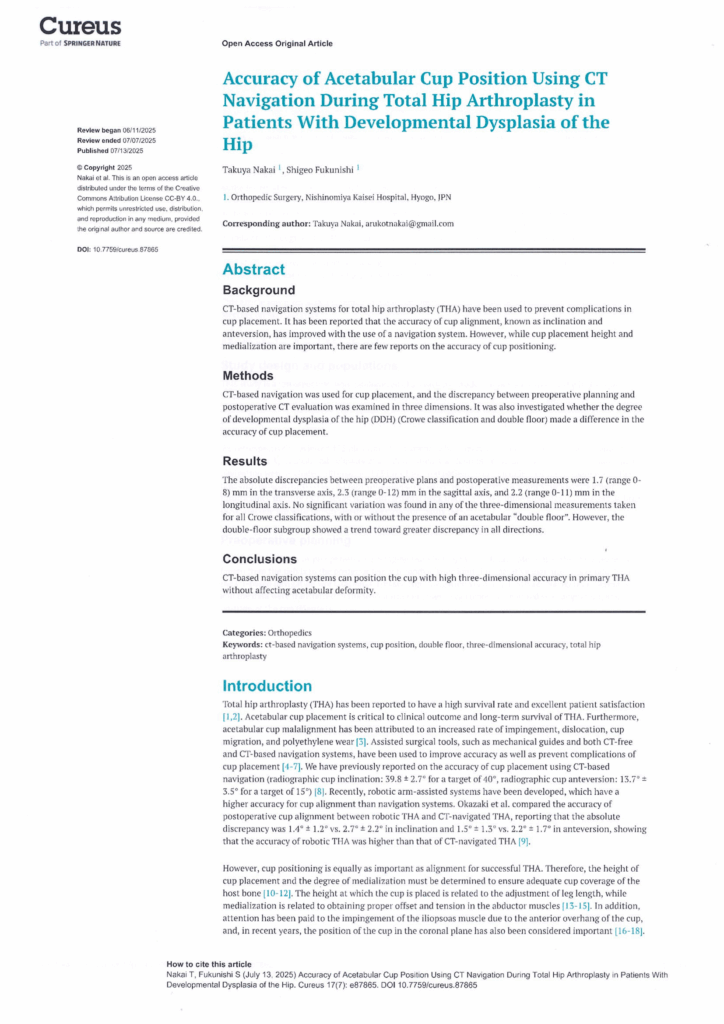 当院の整形外科 中井(Dr.)が執筆した「Accuracy of Acetabular Cup Position Using CT Navigation During Total Hip Arthroplasty in Patients With Developmental Dysplasia of the Hip 」論文が、医科学分野の国際学術雑誌「Cureus」に掲載されました。