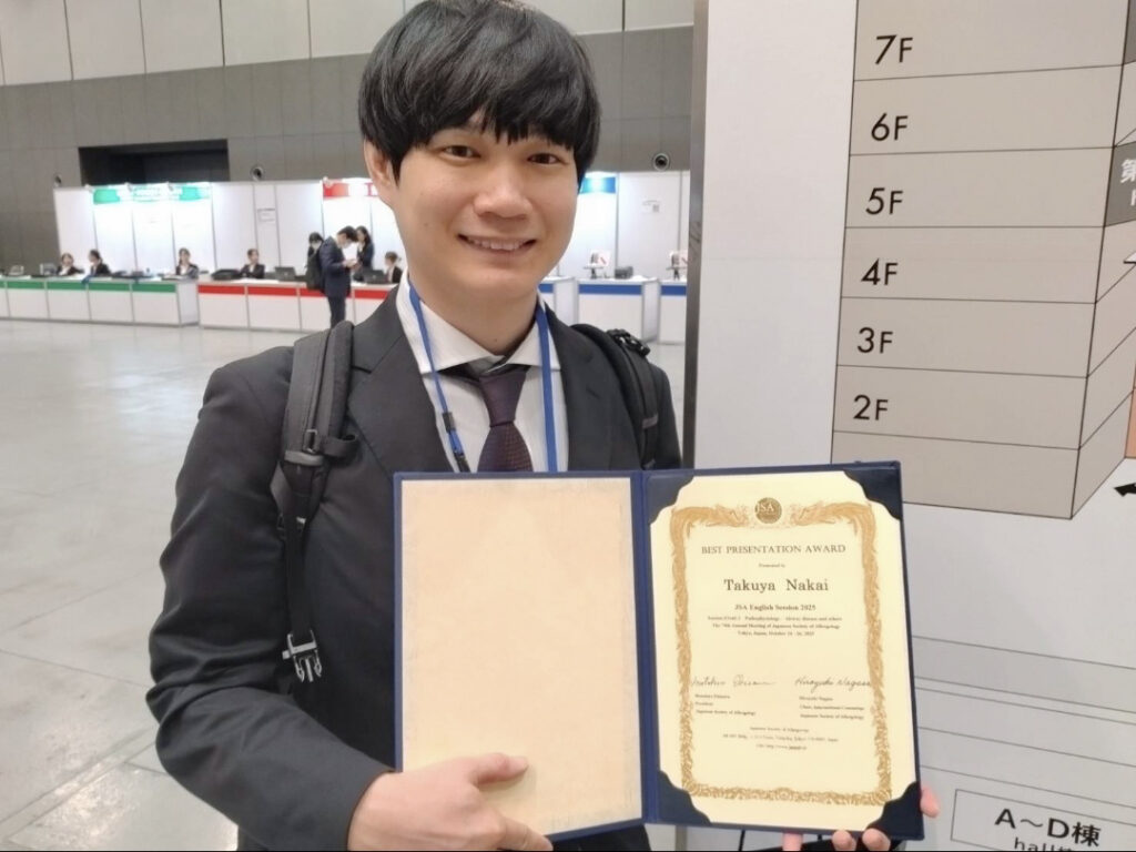 令和7年10月24日から26日まで開催された、第74回 日本アレルギー学会学術大会にて整形外科の中井医師が「BEST PRESENTATION AWARD」を受賞しました。ご協力いただきましたすべての方に感謝いたします。