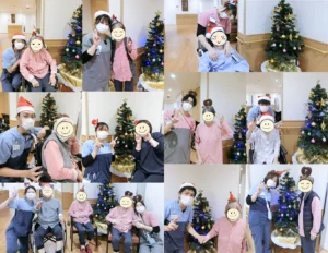 クリスマスツリーの前で患者さんと一緒に写真をたくさん撮りました!撮影前にどのカチューシャをつけるのか、これがかわいい!などみなさんで賑やかに話しながら選びました。4階はクリスマスイイヴにコンパクトなクリスマス会も予定しています。声を出すこともリハビリの一環として楽しく過ごせればと思います。