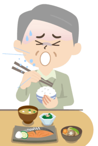 食事中にむせたときは、弱く咳をするのではなく、しっかりと強い咳払いを出すことで、誤嚥のリスクを下げることができます。強い咳によって、気管の入り口付近に入った食べ物を外へ排出しやすくなります。