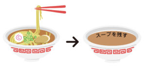 うどんやラーメンなどの麺類には「麺」と「スープ」の両方に食塩が多く含まれているため、ラーメン1杯を食べると、約1日分の塩分を摂ってしまう可能性があります。スープを全部飲み干すと1日に必要な塩分摂取量を超えてしまうため、麺と具を食べてスープは残すようにしましょう。