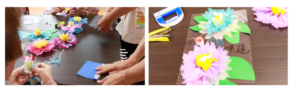 今月は、睡蓮の水面をイメージした夏らしい作品づくりを行いました。