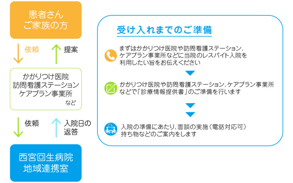 在宅医(かかりつけ医)、訪問看護ステーション、ケアマネジャーなどの在宅で携わりのある事業所から入院予約の申し込みをお願いします。(※予約制のため緊急時は困難な場合があります。)
