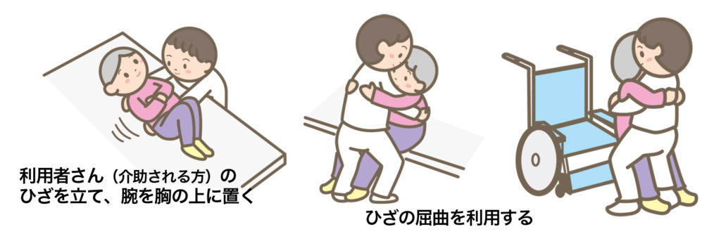 利用者さん(介助される方)を水平方向に移動しようとすると介助の負担は少なくなります。持ち上げたり、前傾姿勢を取ると腰に負担が集中して腰痛の原因になります。移動や移乗の際には、腰に負担がかからないように「ひざの屈曲」を利用します。また、利用者さん(介助される方)の腕を胸のうえにのせたり、利用者さん(介助される方)のひざを立てるなど、できる限り力が分散しないように利用者さん(介助される方)に小さくなってもらうと、介助しやすくなります。