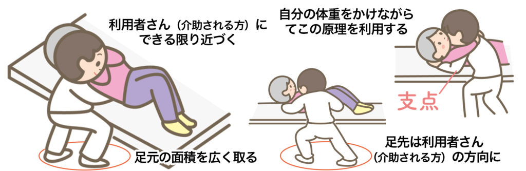 不自然に身体を曲げたり、ねじると腰痛の原因になるので、足先の位置を利用者さん(介助される方)に向けておきます。「持ち上げよう」と思わず、てこの原理をイメージして、シーソーのように支点を作り自分の体重をかけることで軽い負担で介助できます。