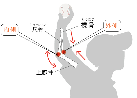 野球ひじの症状はいくつかの種類があり、ひじの痛みが出る部位によって「内側型、外側型、後方型」に分けられ、発症する時期によって発育型と成人型に分類されます。野球ひじを発症する子どもの投手の約60%以上は、「発育型」の「内側型」の症状があるという研究結果も出ているほど多発しています。