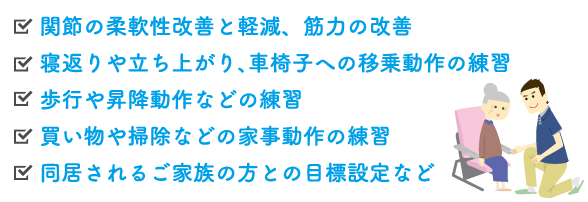当院では、入院から退院、そして退院後の訪問リハビリまで、患者さんに継続的なリハビリをご提供しています。訪問リハビリに関するご質問で最も多い「訪問リハビリって、ただリハビリをするだけですか?」というご質問です。このご質問に関しては、リハビリだけではなく、リハビリを中心にさまざまな内容をご提供しています。