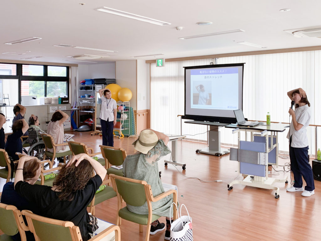 今回はスライドを使ってご説明する時間よりも、実際に体を動かしていただく時間を長く設けて、講師担当のスタッフと一緒に「転ばない姿勢のストレッチ」などを行いました。「姿勢をよくしよう」と思うと、腹筋や背筋に意識が向いてしまいがちですが、首や太もも、ふくらはぎも重要になることをお伝えし、ご自宅で実践しやすいストレッチ方法をご紹介しました。参加された方からは、「ストレッチがその場でできる点がよかった」という感想もいただきました。