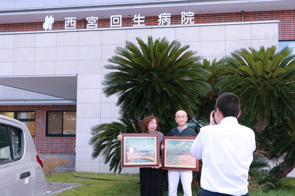 この絵画を贈呈いただくきっかけは、夙川にあった「ラ・パボーニ」という喫茶店が結んだご縁でした。当時、「ラ・パボーニ」を経営されていた画家の大石輝一さんが描いた香櫨園浜の風景画を、三代目店主の福井ひでのさんが大切に保存されていました。今回は、その貴重なコレクションのなかから、当院の建築物が描かれている絵画を福井さんのご好意により寄贈いただきました。