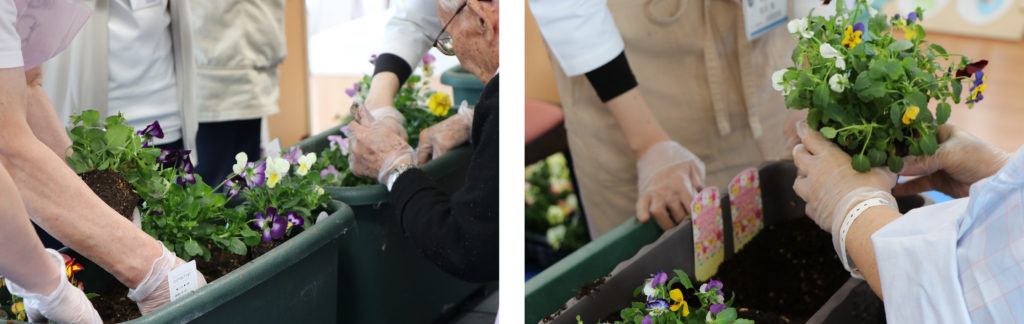 今月は、ビオラの苗とチューリップの球根を植える作業でした。用意していた肥料を加え、土が柔らかくなるまでよく混ぜてから、お一人ずつ好きなビオラの花株とチューリップの球根を選んで、植えていただきました。