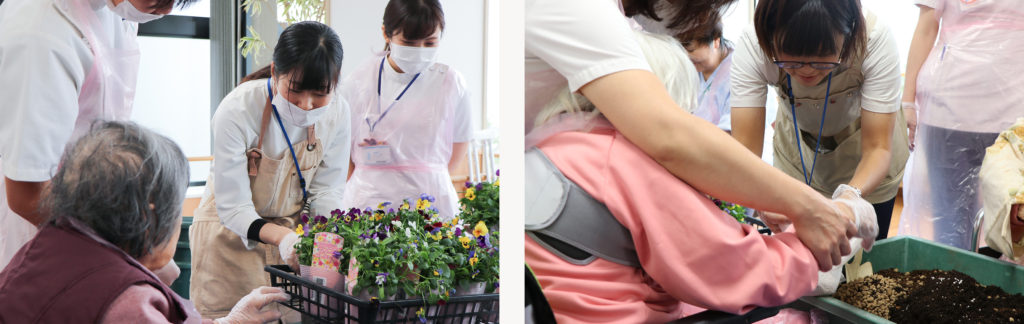 当院の療法士や看護師と豊中平成病院から園芸療法士が来院し、患者さんと一緒に季節の花を植えて育てる活動を実施中です。