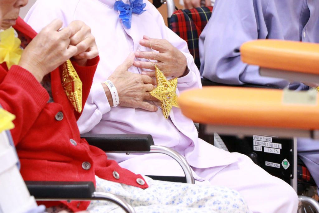 まずは、参加いただいく患者さんの服にリボンや星を付けて、クリスマス会の雰囲気を盛り上げてスタート! 飾り付けるオーナメントをみなさんにお渡ししながらスタッフが参加を募りました。