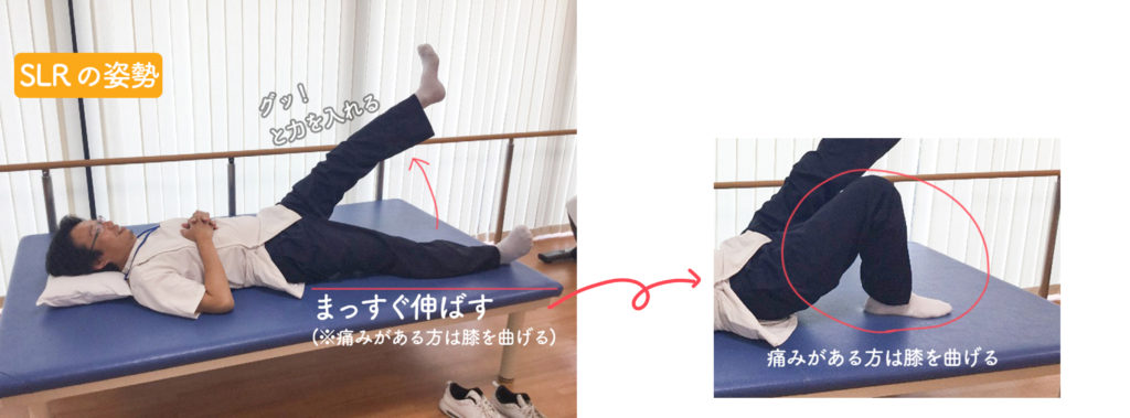 まずは、下肢の筋肉で最も大きな「大腿四頭筋(太ももの前の筋力)」を鍛えるトレーニングです。SLR (Straight Leg Raising Test下肢伸展挙上)という横になった状態で膝関節を伸ばしたまま脚を持ちあげる運動です。