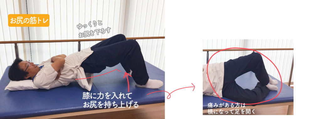 - 臀部(お尻)と膝に力を入れお尻を持ち上げる