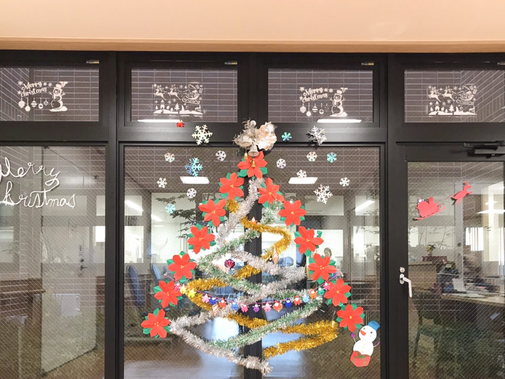 デイケア内に手作りクリスマスツリーを作成しました。クリスマスツリーに使用している「ポインセチア」も、利用者さんと一緒に折りました。完成したツリーを見て「たくさん折った甲斐があったね〜!」と高評価をいただきました!! 今月はハロウィンに続き、クリスマス会を行う予定です。