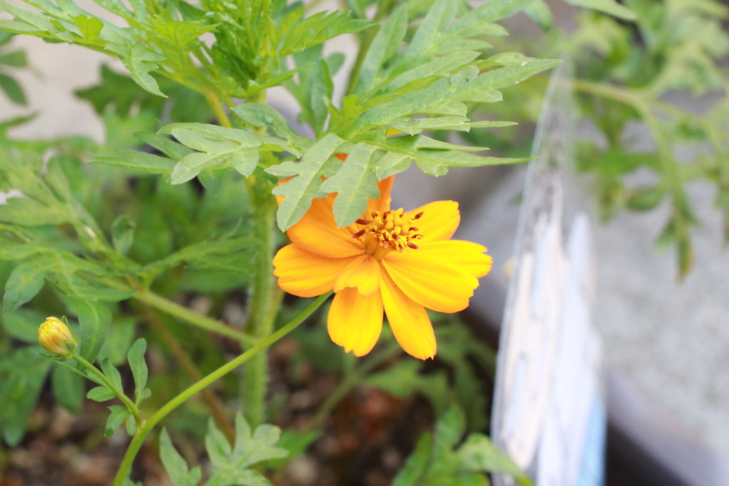 「ひまわり」と同時期に植えた「コスモス」も開花しています。「コスモス」といえば、秋に咲くピンク色のイメージがありますが、今回植えた品種は夏に咲く「コスモス」で「キバナコスモス」というそうです。ピンク色の花が咲くと思っていたため、開花した瞬間は利用者さんもスタッフも驚くばかりでした。