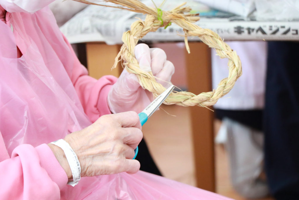 今回は、スタッフと患者さんが2人1組になって、撚りをかけながら藁を左に綯うところから始まりました。藁を綯い終わったら、お好きな大きさで結び、形を整えていきます。