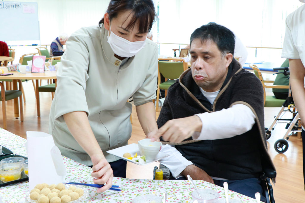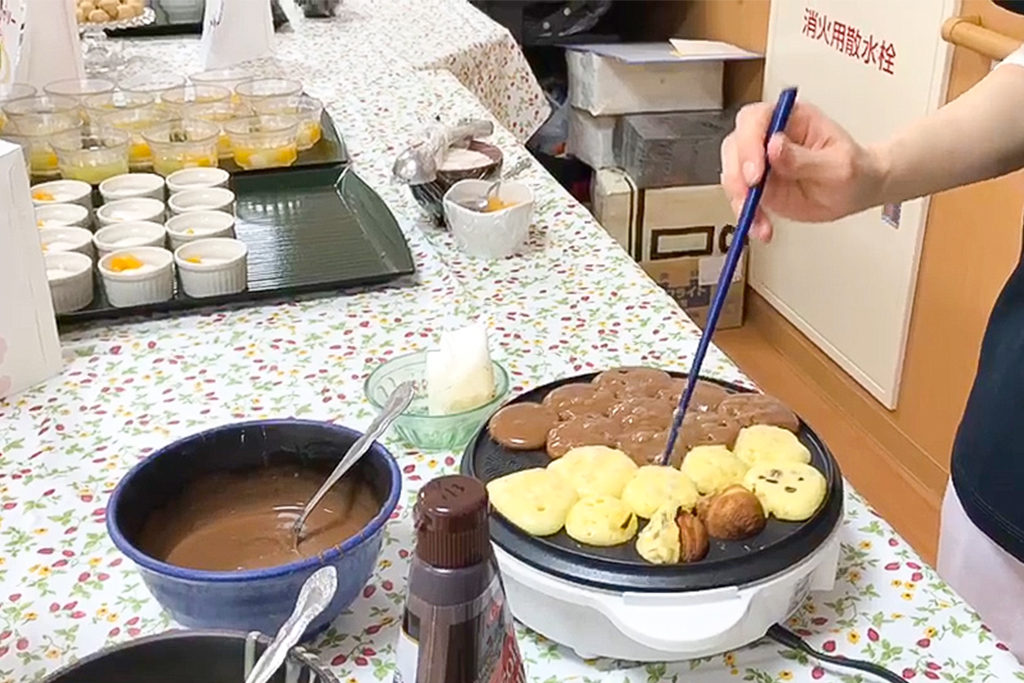 また、目の前でつくる「プチマフィン」の甘い香りに寄せられて、焼きたてを待つ利用者さんがとても楽しそうでした。ココア生地のなかにチョコを入れると、チョコ好きな利用者さんが早速受け取って、完食されていました。