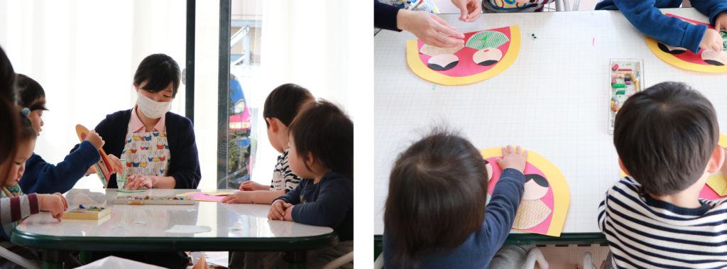 台紙にのりづけできない子どもには保育士が隣で手伝いますが、指先を使う作業を大切にしているので、小さい指を器用に動かして作品を完成させていきます。