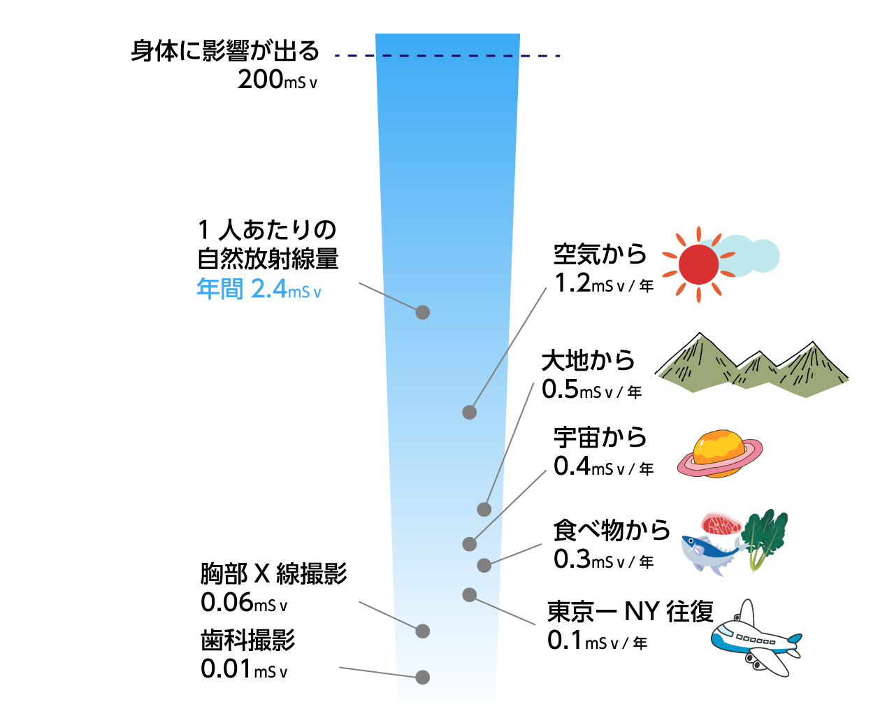 例えば、健康診断などで撮影する機会が多い胸部X線(放射線)を1回撮影すると0.06mSvの線量を受けることになります。