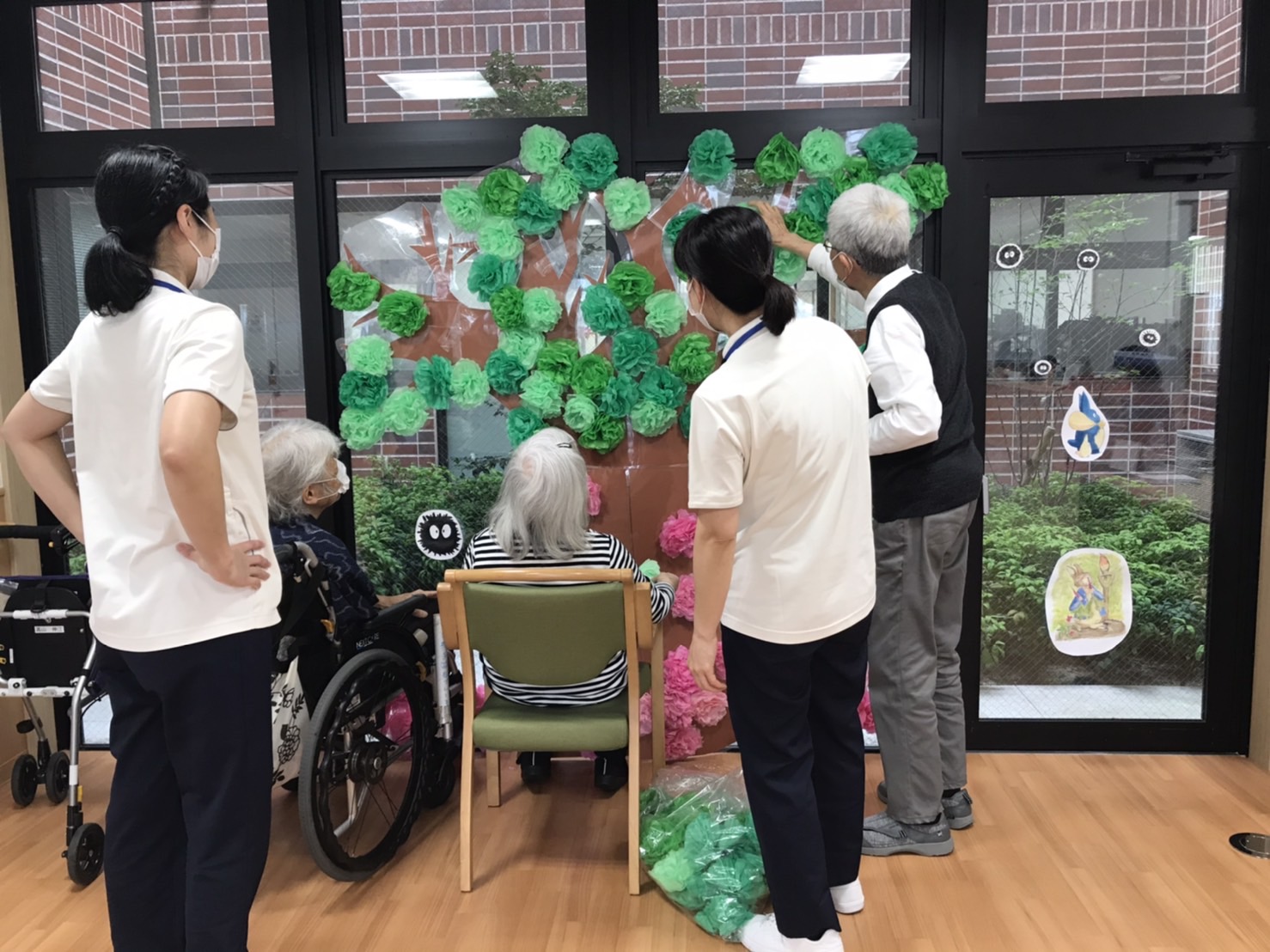 緑いっぱいにすべく、利用者さんにもたくさん緑の花飾りを貼り付けていただきました!!