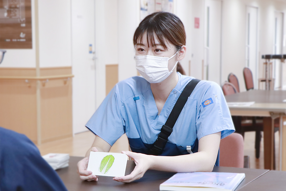 ことば・声に関するコミュニケーション機能・機能回復を中心に「話す」「声を出す」訓練をはじめ、「食べられない・飲み込めない」ことを改善し、患者さんが「口から食べる」生活を支援します。食べられる形態を維持できるよう摂食嚥下リハビリにも注力します。また、誤嚥性肺炎の予防訓練にも同様に取り組んでいます。
