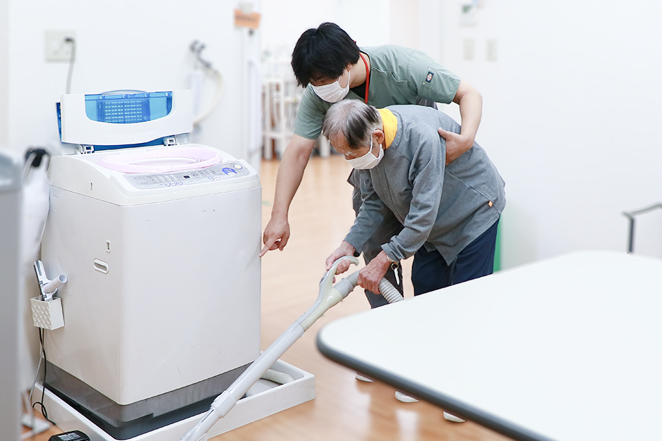 運動療法や生活に必要な動作訓練を主軸として、特に家事動作や仕事などで必要になる作業動作の能力の回復を促すリハビリを実施します。なかでも障害や病気などによって麻痺や身体機能が低下した際に動作を補うための道具や装置(自助具)を使用したリハビリ動作の訓練を行い、動作回復のサポートも行っています。