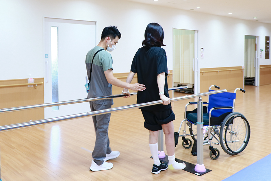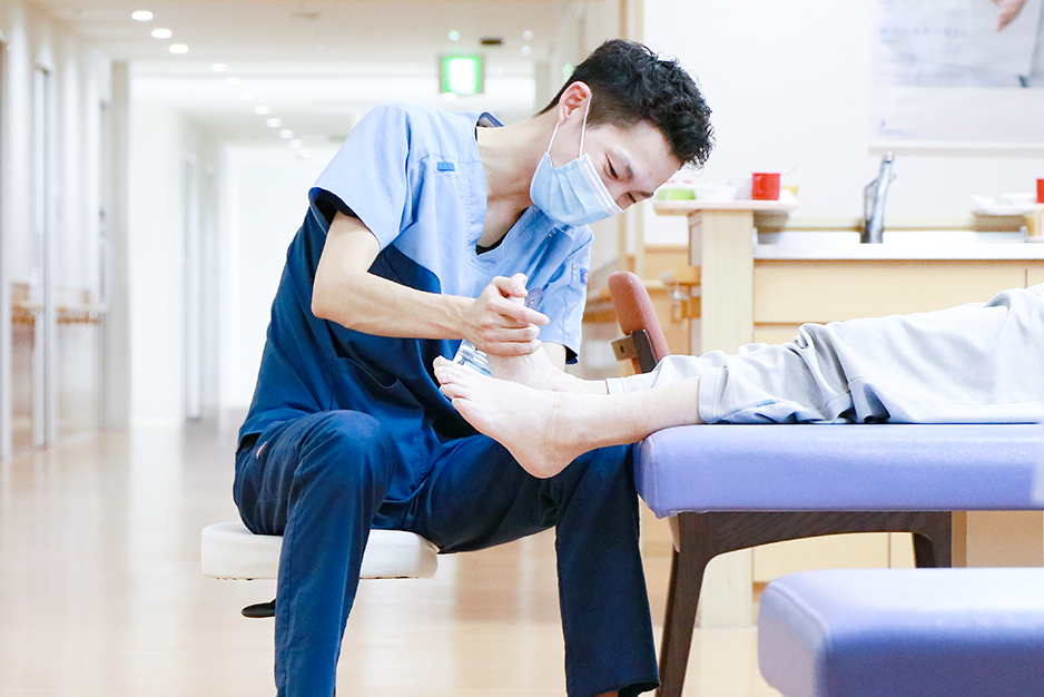 歩行練習などの運動療法を中心に、まずは歩くことに注力したリハビリを行います。歩くために筋力を温ためたり、電気などの物理療法等を活用して、硬くなった筋肉をほぐす、身体機能や動作の回復を促すリハビリも並行して行います。医療用装具を使用したリハビリも実施します。